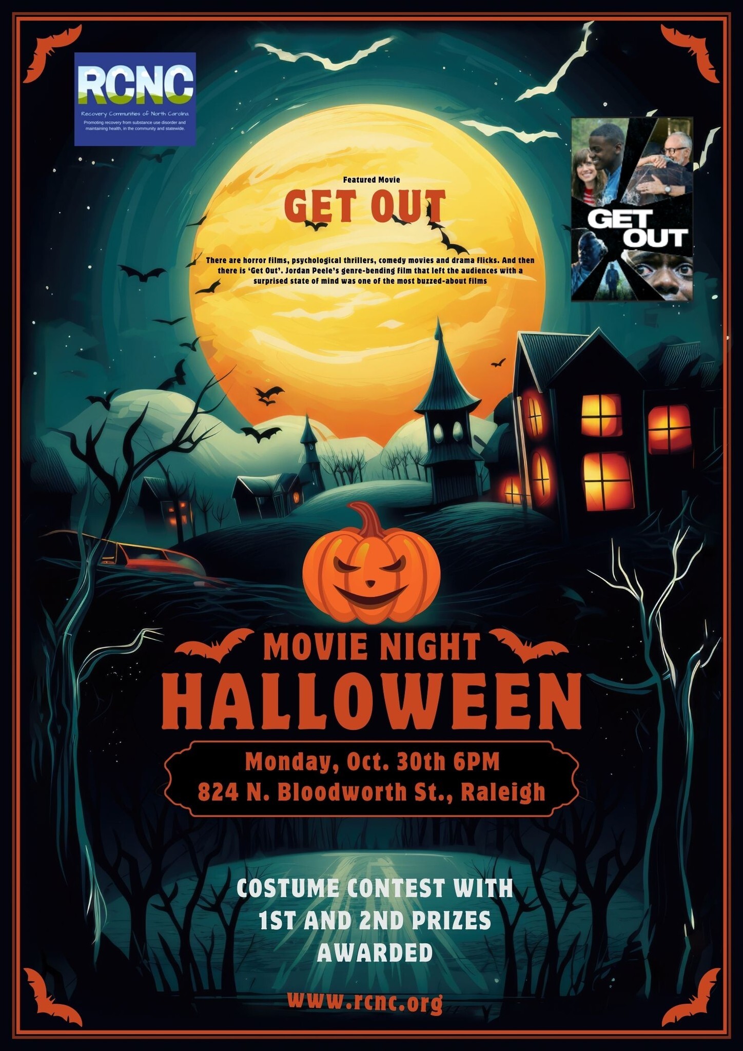 You're invited to join us for a Halloween-themed movie night filled with chills, thrills, and unforgettable fun as we celebrate recovery in style! Date: Monday Time: 6:00 PM. We'll be screening the hair-raising and thought-provoking movie "Get Out" to set the perfect Halloween mood. Buckle up for an eerie and exhilarating journey! Costume Contest: Show off your most creative Halloween costumes inspired by the movie, and you could win fantastic prizes! There are awards for the top two spooktacular outfits. This is your opportunity to connect, share your recovery stories, and strengthen the bonds that make recovery a journey filled with hope and support.